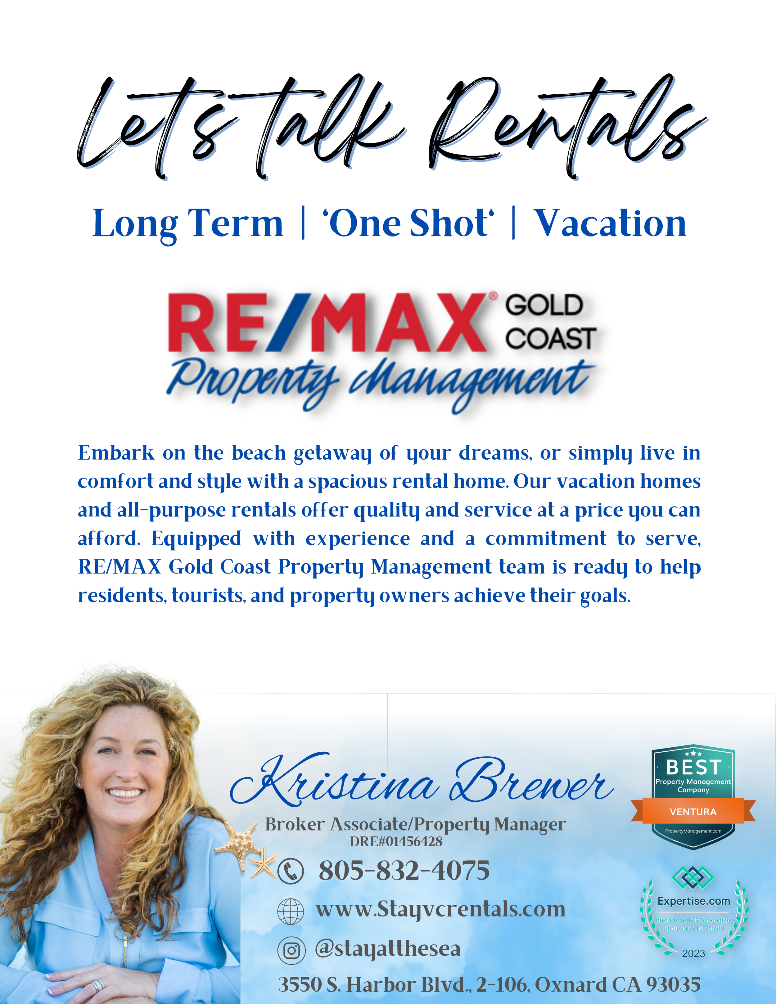 Kristina has been in the real estate business since 2003. She started off in real estate sales for a large national brokerage but found her passion was in property management and started RE/MAX Gold Coast Property Management in 2010. Her background in restaurant management and customer service prepared her for working with both owners and renters alike. “Customer service has always been key in my business coupled with my love of the area I have been able to help many understand the value in their homes while sharing our little gem of the Channel Islands area”.
